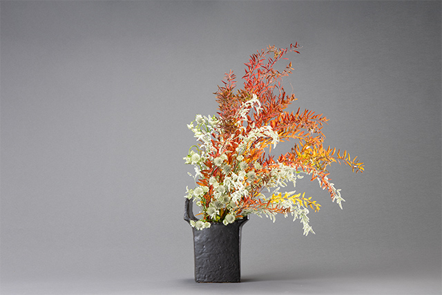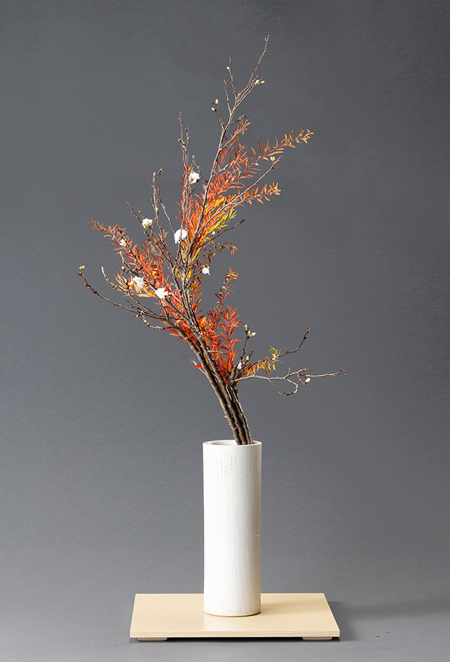 雪柳は春の白い花から夏の新緑、秋の紅葉まで一年の大半は花材として使われています。今回は白い花と合わせて、より紅葉の赤が引き立つように挿れました。