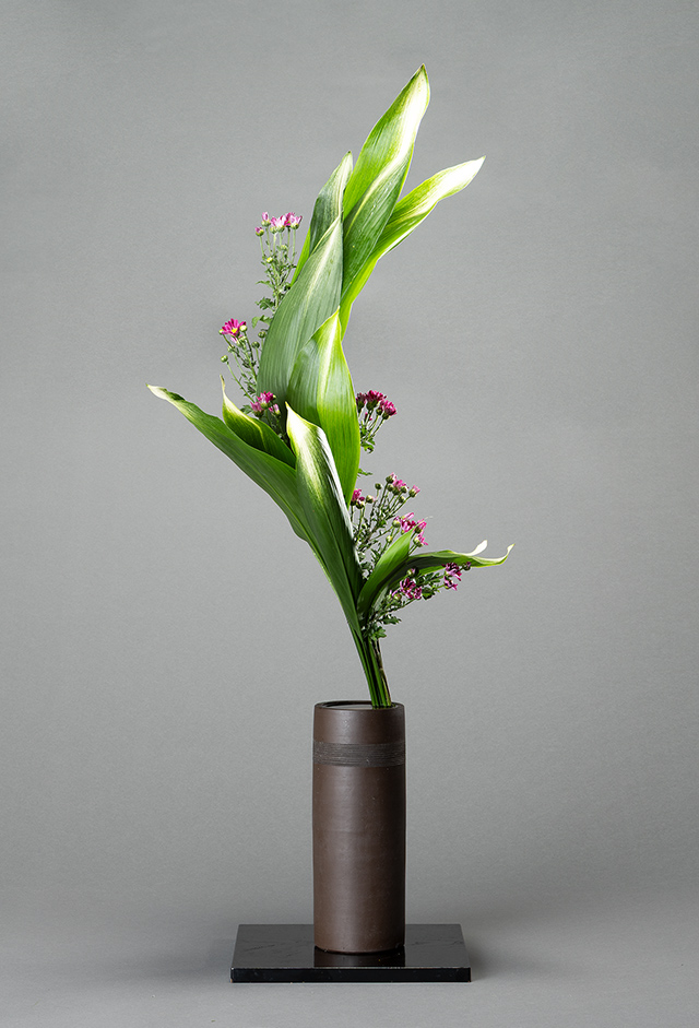 伝書「体用相応の巻」に葉蘭の挿け交ぜ応合いの方法があり、白い斑や縞のある葉にナデシコやセンノウなどを体と体添えの間や体用の間などに挿け交ぜます。花図書「千種乃錦」に良い作例があるので、参考にして今回は小菊を応合って挿れました。