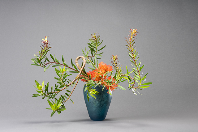 曲がりくねったリューカデンドロンが手に入ったので挿れてみました。折角の動きも葉が邪魔するところもあり、程よく省いて動きを出して根元をピンクッションで締めました。