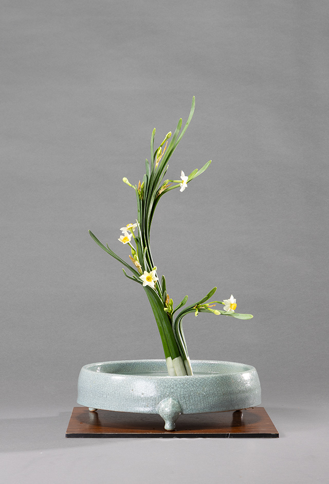 水仙は背丈に応じて株の数を多く挿ける事ができます。今回は体に三元、用にニ元、留にニ元挿れて三才格にしています。株が増えても全ての葉が効果的に見えるよう工夫が必要です。