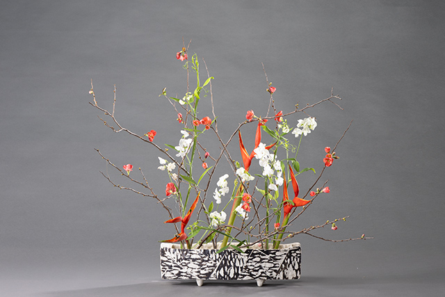 木瓜は和花とはもちろん合わせやすいですが、枝の動きが面白く洋花とも相性が良い事が多くあります。今回はカニの爪のようなヘリコニアと枝スイートピーがよく合い、色も紅白で正月らしくなりました。