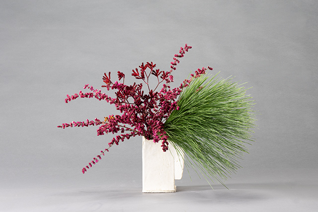 大王松は長い葉が美しく、立てて挿れるよりは傾けて線の動きを出すのが一般的です。今回はあまり花材を交ぜ合わせずに左右に分けてそれぞれの特徴を生かしています。
