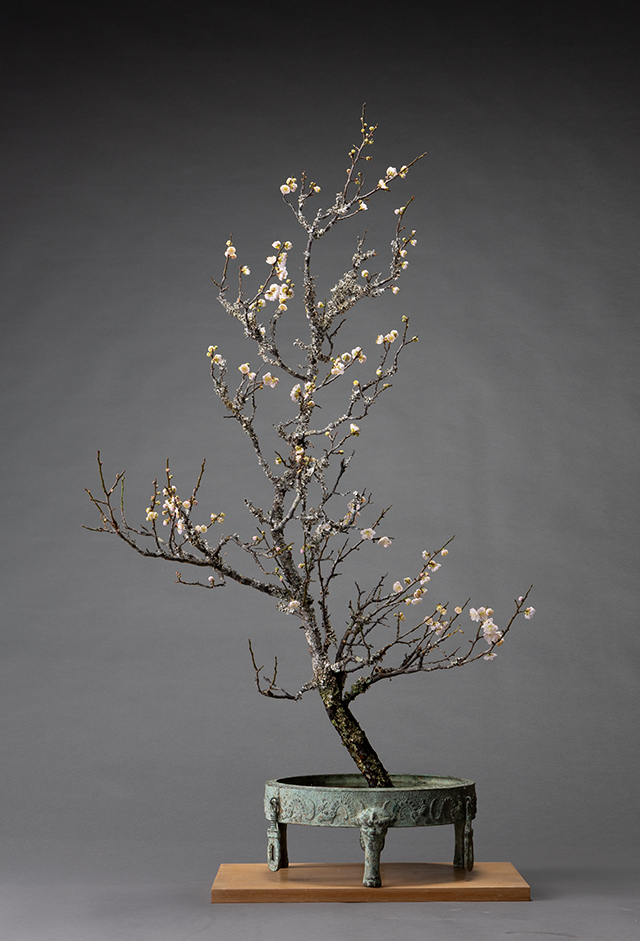 写真では白く見えてしまうほど、梅の花は薄らとしたピンク色をしています。枝ぶりや苔付きも良いので体はあまり手を加えず自然のまま使い、用と留を体に合わせて動きを付けました。