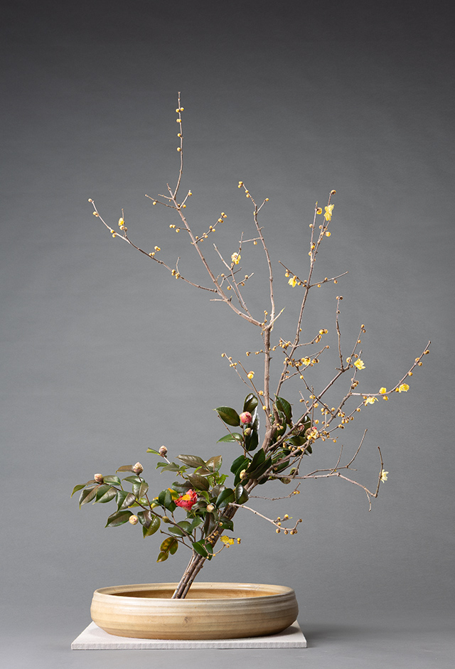 香り良く蝋細工のような透明感のある黄色い花を咲かせるこの花材は、寒い冬によく似合います。枝ぶりは単調で折れやすく格花には難しいですが、今回は椿を留に使いボリュームを出しました。